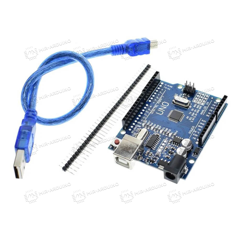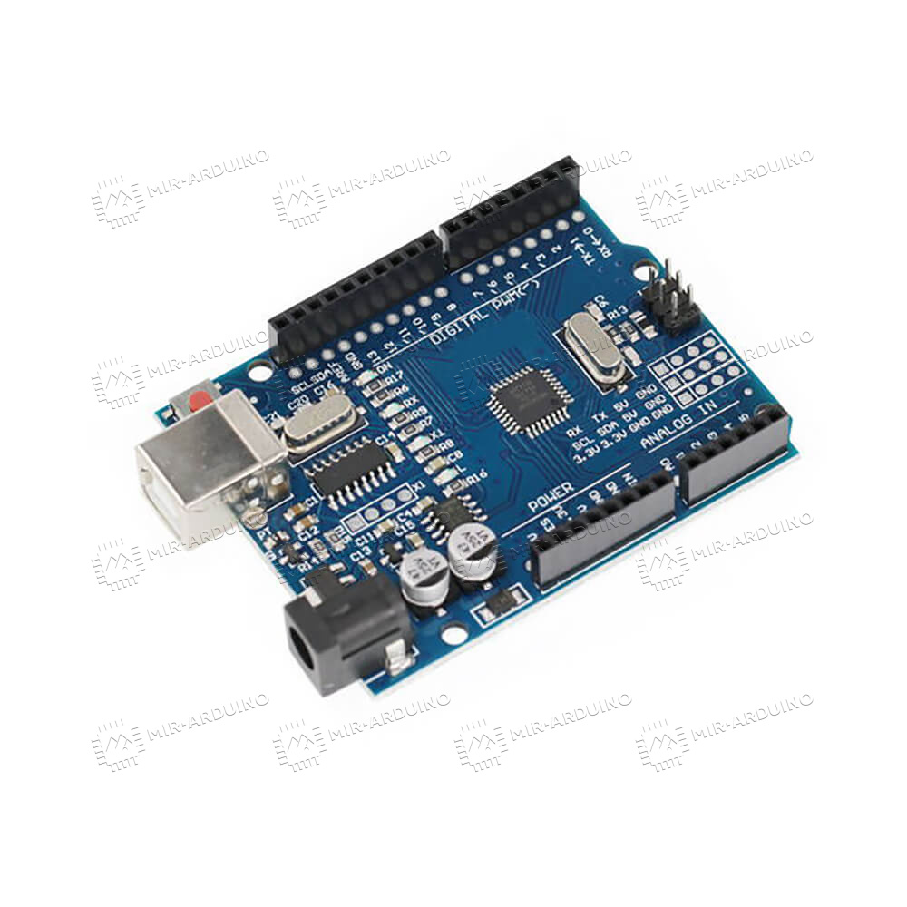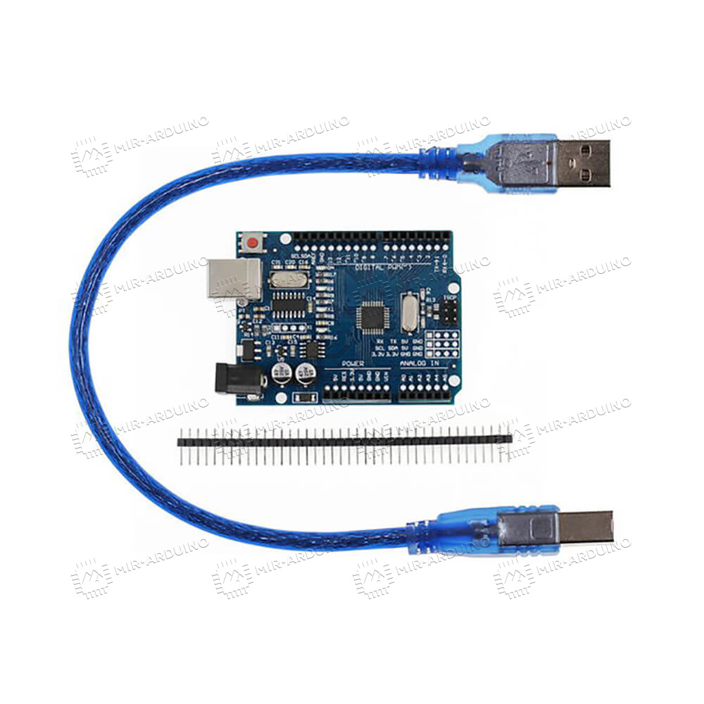 Плата Uno R3 (Arduino совместимая) - это платформа для моделирования и программирования роботов, электронных устройств. Стандартная плата Uno R3 оснащена всеми необходимыми разъемами для комфортной работы: 14 цифровых входов и выходов, порт USB для подключения к компьютеру, разъем для подключения питания. Набор для моделирования Ардуино подойдет начинающим робототехникам, так как является стандартным и простейшим для освоения. Набор для Arduino оснащен 32 Кб памяти для загрузки прошивки. Электроника для начинающих на базе Ардуино имеет открытую форму, поэтому ознакомиться с ней можно, скачав схему с официального сайта.